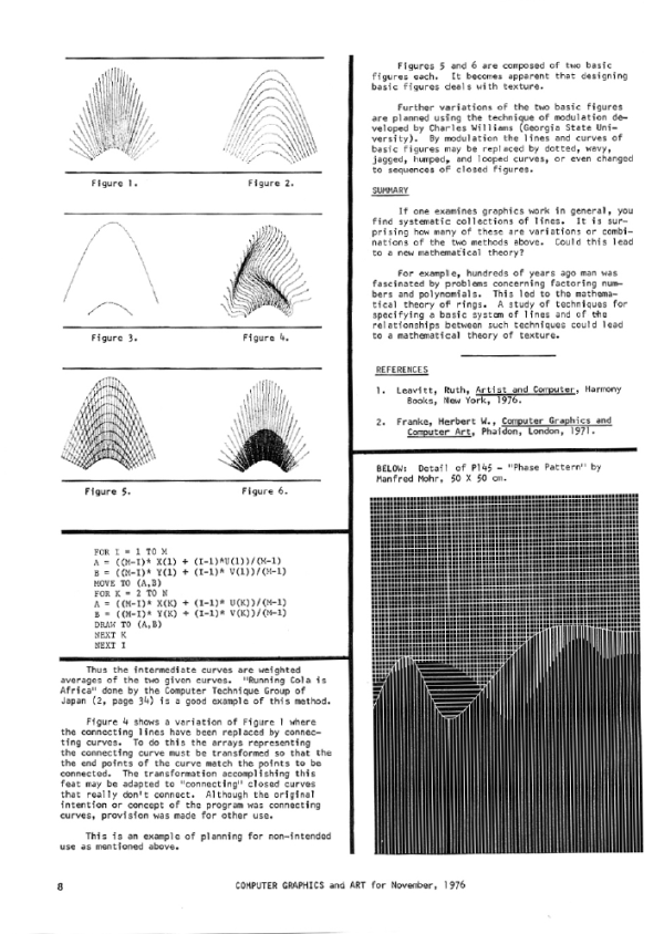 Artists featured: Georg Nees, Charles “Chuck” Csuri, Zdeněk Sýkora, Herbert W. Franke, Ken Knowlton, Edward Zajec, Roger Vilder, Thomas Michael Stephens