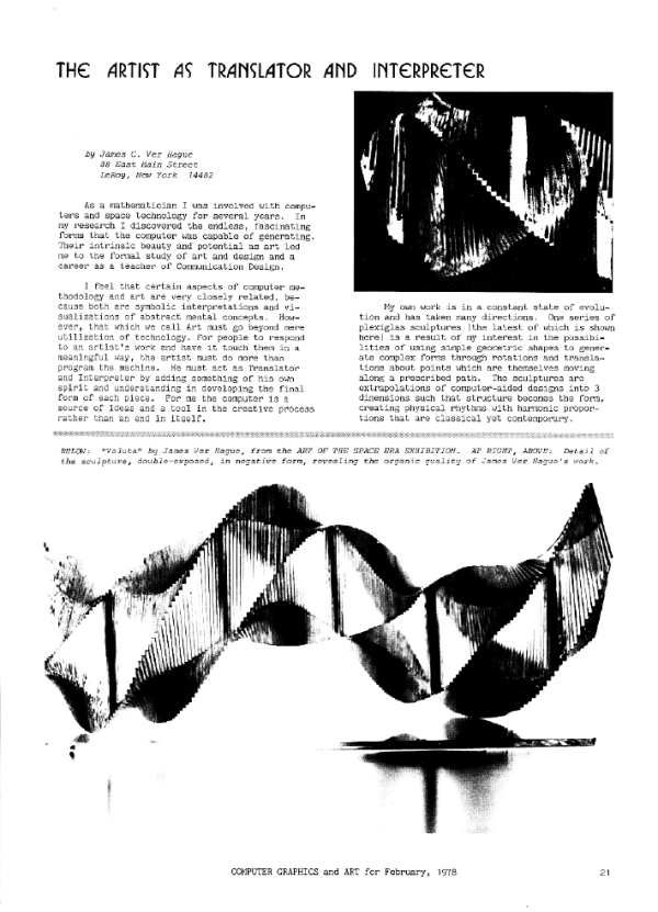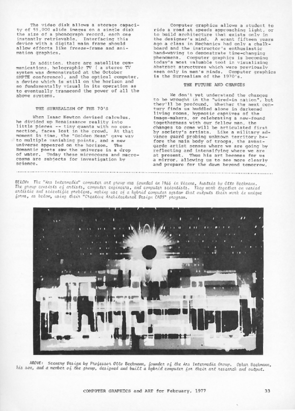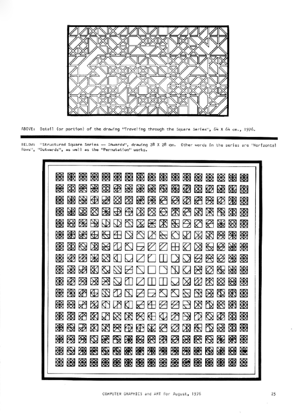 Computer Graphics & Art was an excellent quarterly publication highly focused in computer graphics and computer artists who were using and experimenting with this media back in the 70’s. It was produced in Chico, CA and published by Berkeley Enterprises Inc. The magazine worked for only 3 years, the time for publishing 12 great issues from 1976 to 1978. Each magazine has around 35 pages including essays, several illustrations from works and studies and descriptions from different artists such as Manfred Mohr.