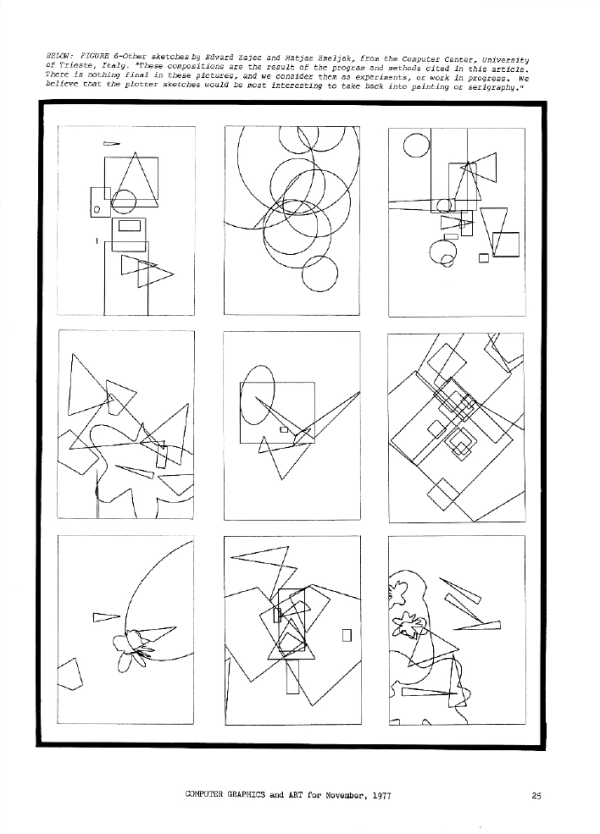 Artists featured: Georg Nees, Charles “Chuck” Csuri, Zdeněk Sýkora, Herbert W. Franke, Ken Knowlton, Edward Zajec, Roger Vilder, Thomas Michael Stephens
