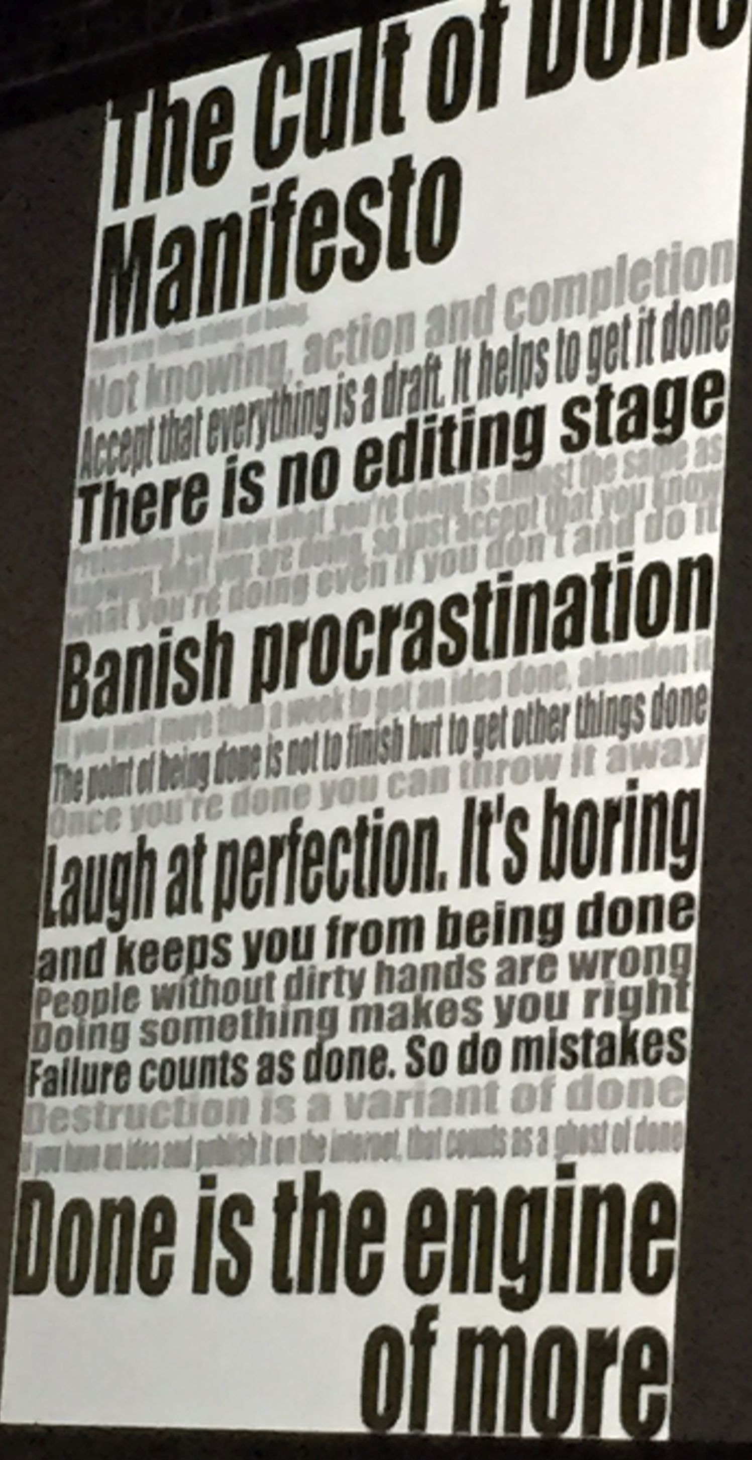 This past week at #SOLIDWORKS World 2015 I heard a great talk from Bre Pettis, one of the founders of MakerBot. As a designer, I always enjoy listening to others in the field and believe we can always learn from and inspire each other. This week, I’ll leave you with a snap of one of his slides regarding his “The Cult of Done Manifesto.” Food for thought! #SWW2015