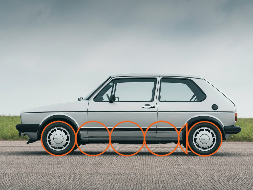 Overhang: The part of the body that doesn’t reside within the wheelbase of the vehicle.
